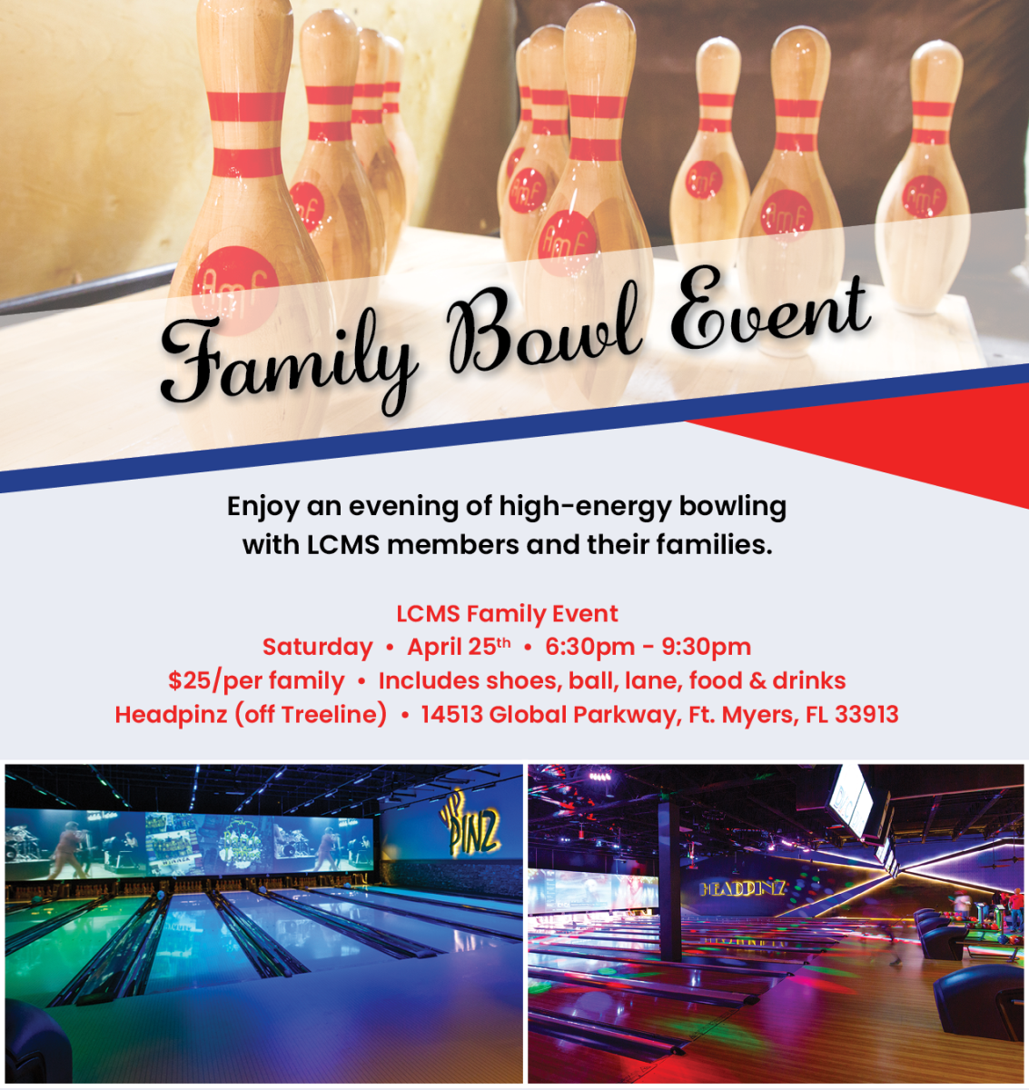 Join your fellow LCMS Physician families in bowling at HeadPinz on Treeline. Food and fun are on hand for this exciting event.